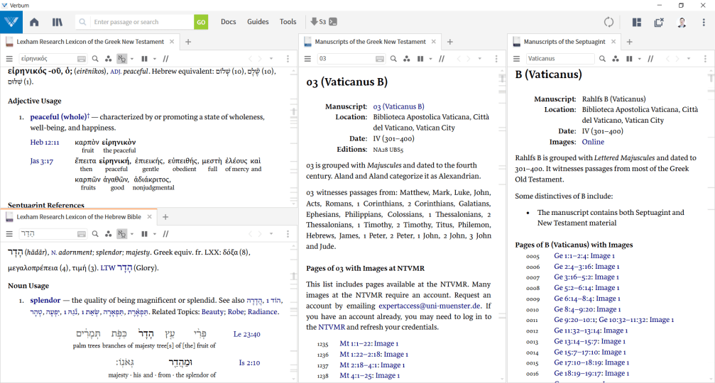 We have some ideas about how to integrate these manuscript resources even further with existing apparatuses (particularly of the GNT and LXX). No promises, but hopefully we’ll be able to make manuscript data even more accessible from the apparatuses themselves. Cross your fingers.