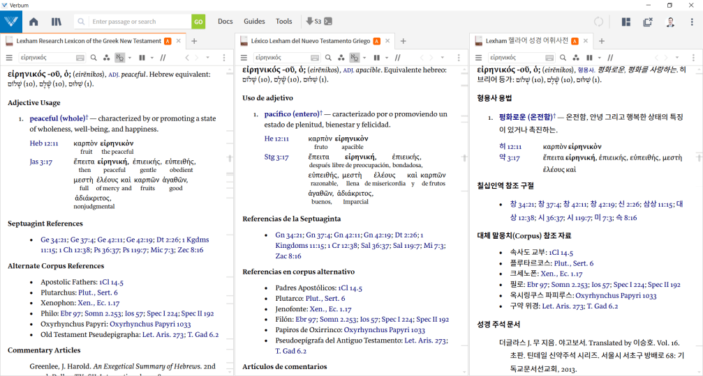 We did some evaluation and figured out that we could use the BSL information to aggregate sense data by lemma and provide the skeleton of a lexicon. Even better: The BSL has been localized into all of the core language editions of Logos Bible Software, so if we could figure out what to do with the English, we’d get six more languages for basically free. Here’s an example of the Lexham Research Lexicon of the Greek New Testament, in English, Spanish, and Korean.