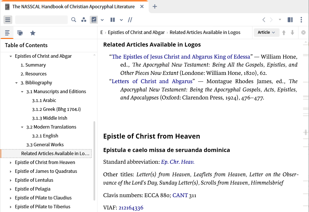 So after talking with folks at NASSCAL about Logos republishing the e-Clavis material for Logos Bible Software, I worked for a bit to retrieve all of their material and faithfully reproduce it so that Logos users could access it within Logos and even go to the e-Clavis itself if they wanted to. The version in Logos Bible Software is called “The NASSCAL Handbook of Christian Apocryphal Literature” and looks like this (on the right):